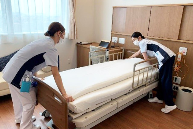 病室の拭き掃除やシーツ交換を行い、清潔を保つよう心がけています。