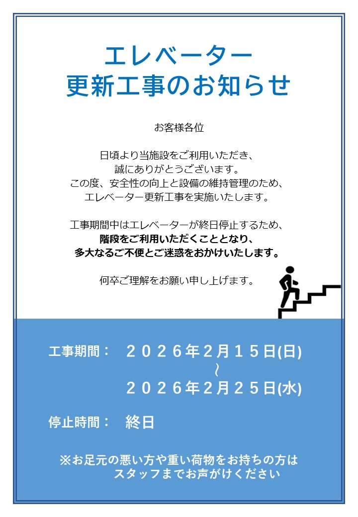 工事期間中はエレベーターが終日停止するため、階段をご利用いただくこととなり、多大なるご不便とご迷惑をおかけいたします。