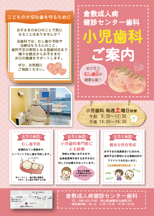 お子さまのお口のことで気になることはありませんか? 当歯科では、むし歯の予防や治療はもちろんのこと、歯列不正の原因となる習癖対応まで様々な観点からお子さまのお口の健康をサポートします。 ぜひ、お気軽にご相談ください。 小児歯科 毎週土曜日診療 午前 8:30~12:30 午後 14:00~16:30 ●ご予約・お問い合わせ 倉敷成人病健診センター歯科 TEL:086-422-2190